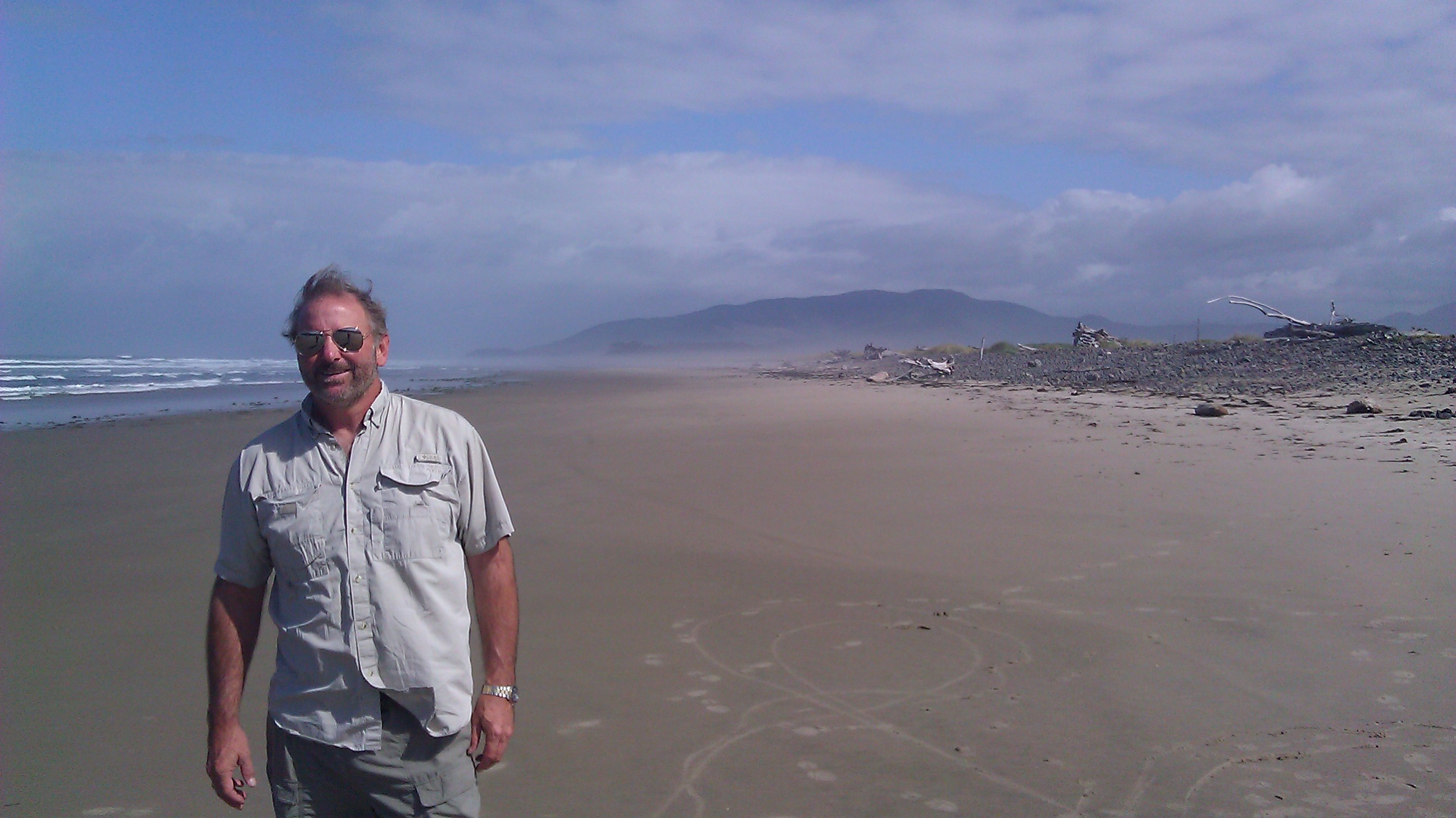 I am looking down a beautiful stretch of golden sand beach and there must be something wrong with my vision, because I don’t see another soul north of Cape Meares. On the dunes, great twisted knots of driftwood are blanching white in the sun, and the high blue and green ocean bluffs break big waves into mottled foam against the sharp black rocks at their bases.